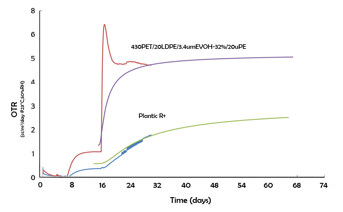 The predicted OTR closely matches the values measured experimentally using a Mocon OTR system. This strong agreement confirms that the observed transient OTR behavior is primarily driven by the high moisture content of the Plantic barrier layer and the diffusion characteristics of the materials Plantic uses.