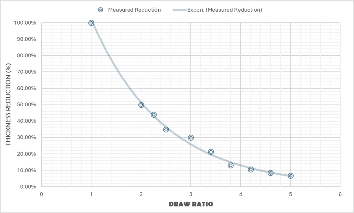 Plantic R+ is designed to support deeper draw applications, with draw ratios of up to 3.6. As expected for higher draw ratios, the reduction in material thickness with increasing depth follows the trend shown in the figure below.