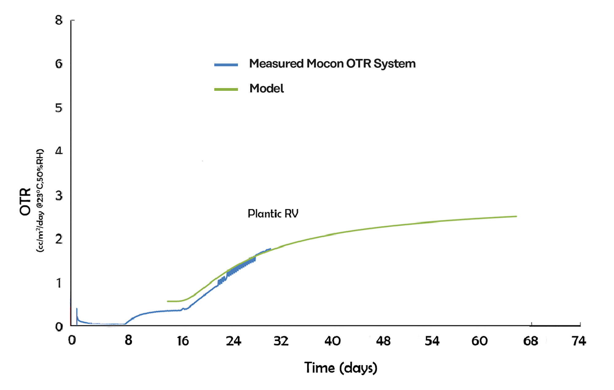 A simulation model is used to predict the time‑dependent (transient) oxygen transmission rate (OTR) of the multilayer structures. The model is based on the measured oxygen permeability and diffusivity of the individual skin and barrier layers.
